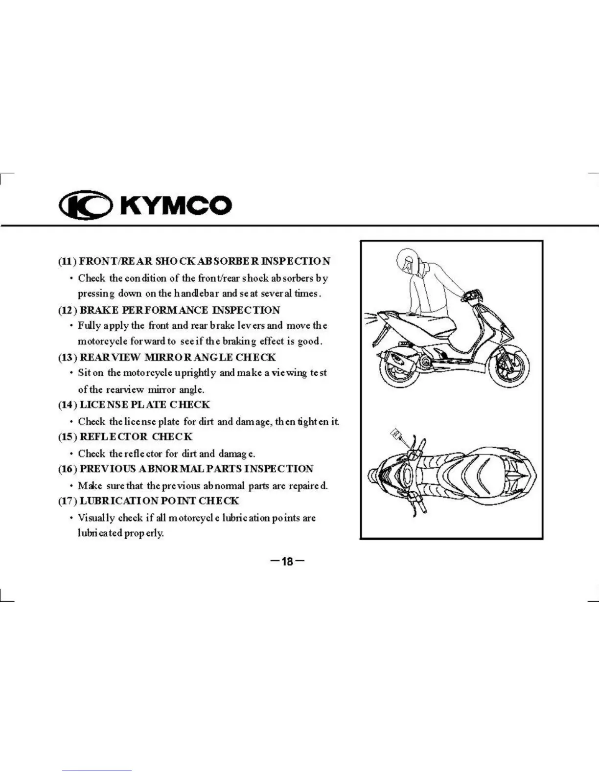 KYMCO Super 9 - Shock Absorber Inspection; Brake Performance Test; Rear View Mirror Angle Check; License Plate Condition Check