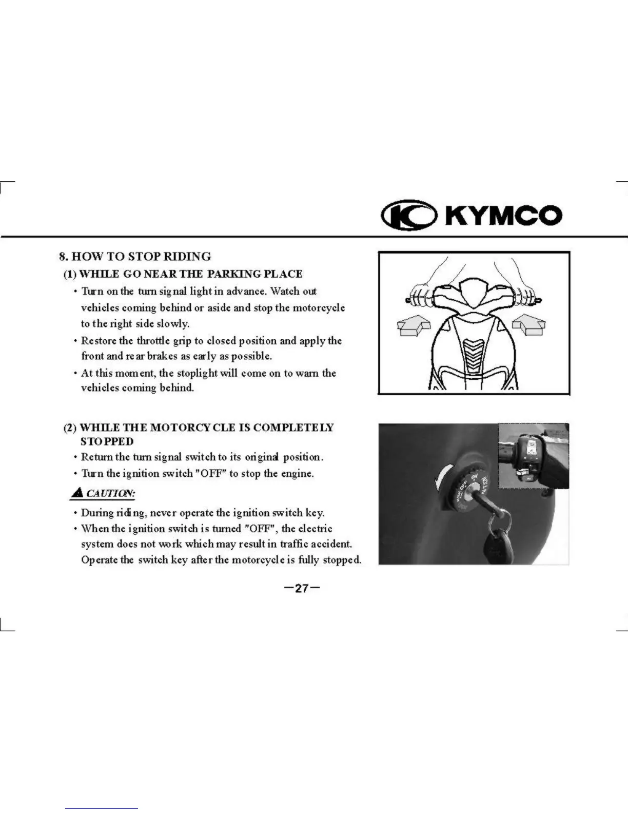 KYMCO Super 9 - KYMCO Motorcycle Stopping Procedures; Approaching and Stopping for Parking; Engine Stop and Safety After Stopping