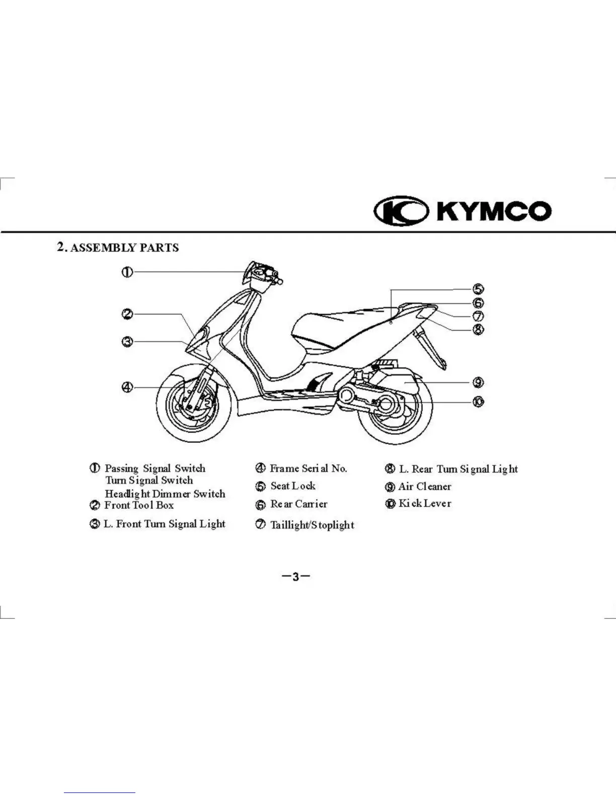 KYMCO Super 9 - KYMCO Motorcycle Assembly Parts Identification; Passing Signal Switch Location; Turn Signal Switch Location; Headlight Dimmer Switch Location