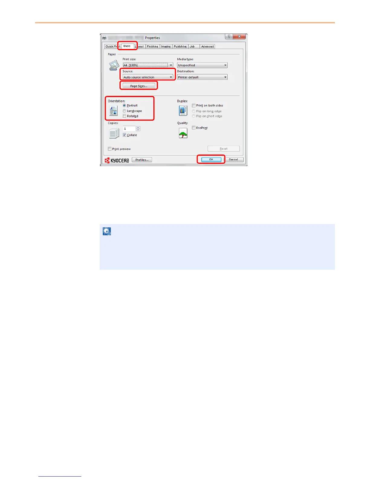 6 Select paper orientation, either Portrait or Landscape, to match the orientation of the