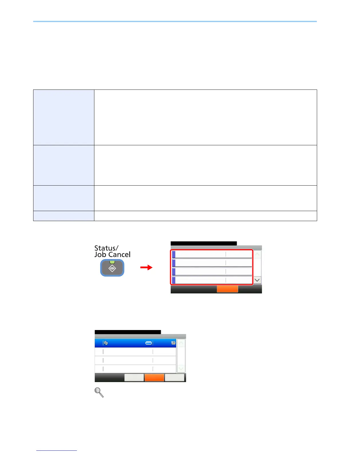 Refer to Print Job Status Screen on page 8-3, Send Job Status screen on page 8-4, Store Job