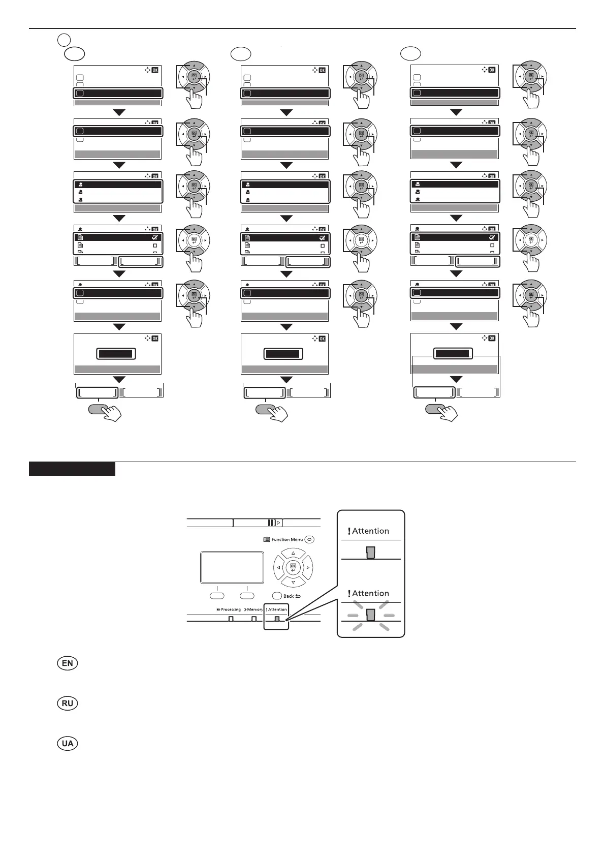 If an error occurs on the machine, the error message appears on the screen. Also the Attention indicator on the operation