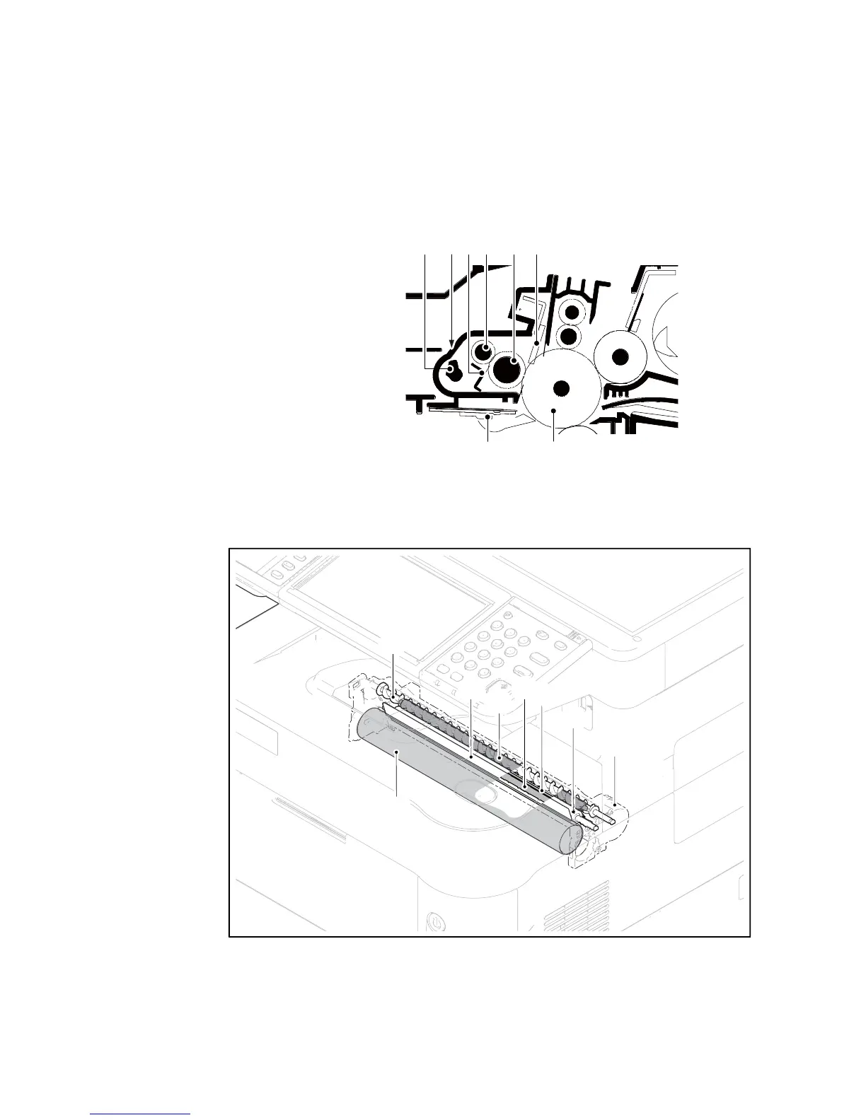 collected to the waste toner box with the drum screw. The cleaning lamp (CL) consists of LEDs and removes