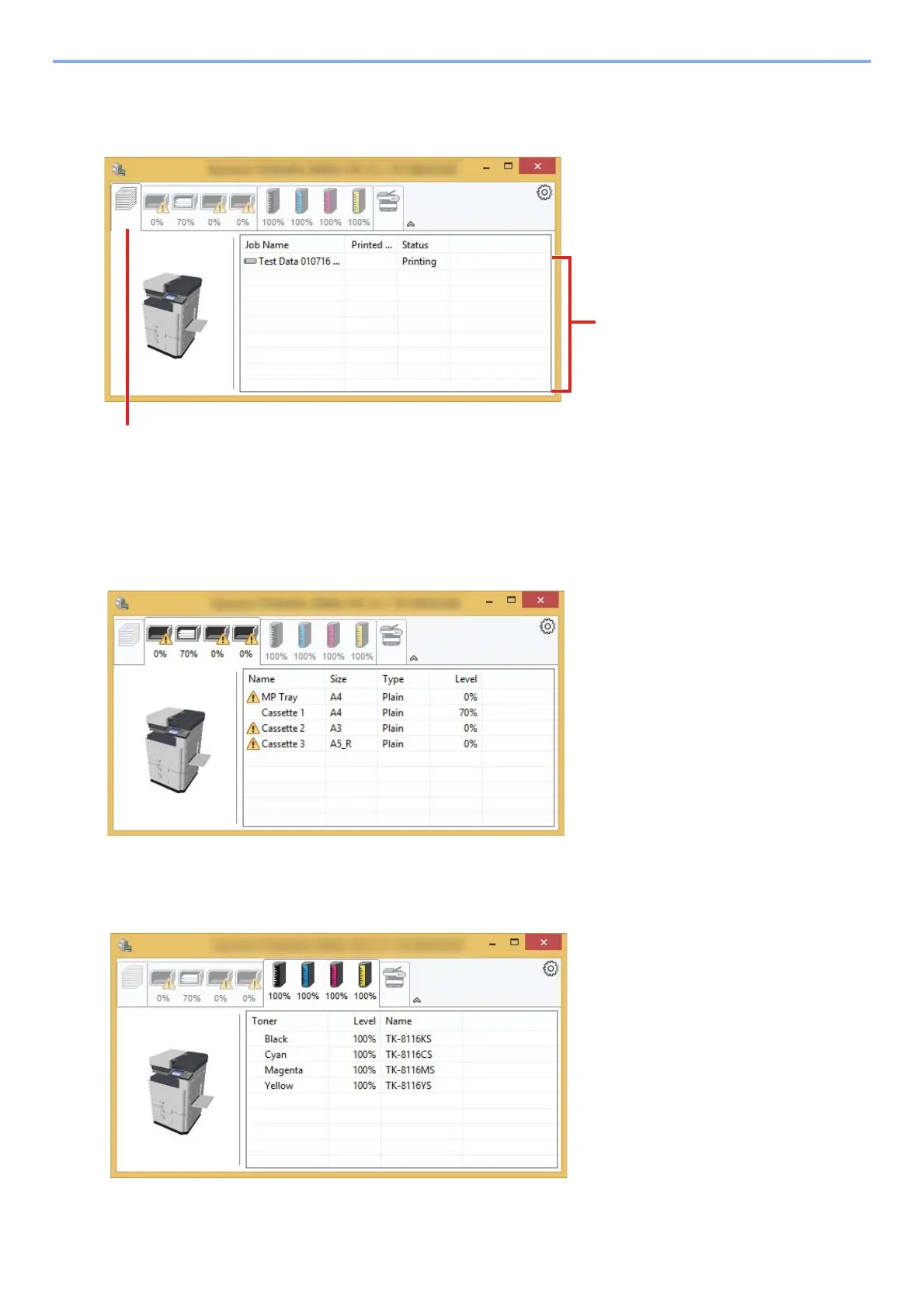 Kyocera Ecosys M812cidn - Printing Progress Tab; Paper Tray Status Tab; Toner Status Tab