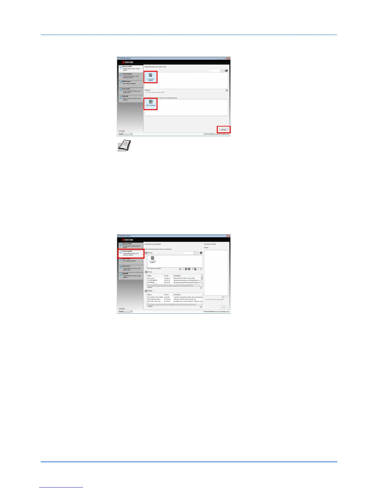 2 Select the machine you want to install, select the Driver Package, and click Install.