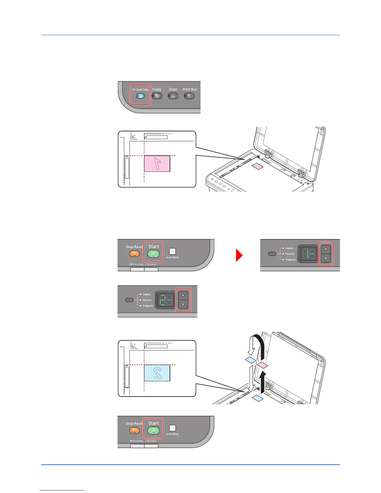 7 Press [Start]. The front and back sides of the card are copied on one sheet of paper.