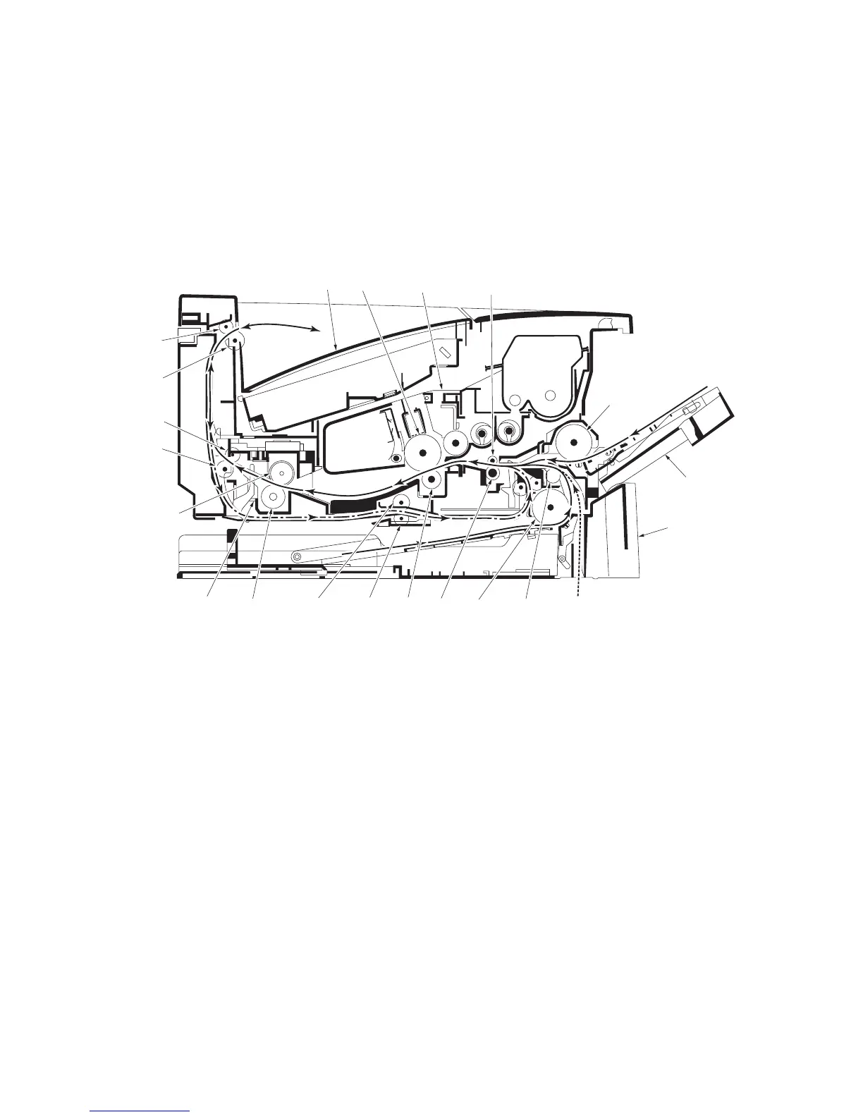 The paper feeding system picks up paper from the cassette, MP tray, or if installed, the paper feeder, feeds it in the