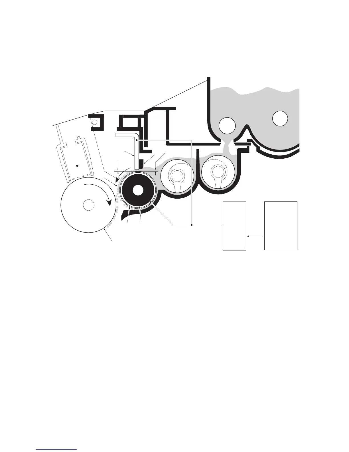 magnet (D), is positioned approximately 0.3 mm above the developing roller (A) to constitute a smooth layer of toner in