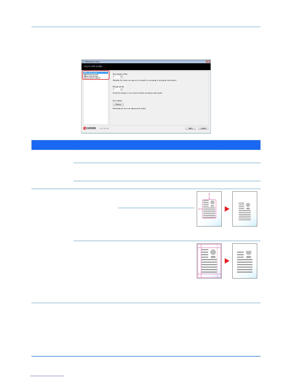 The Maintenance Menu that the user can adjust from KYOCERA Client Tool is described below. In addition, also refer to