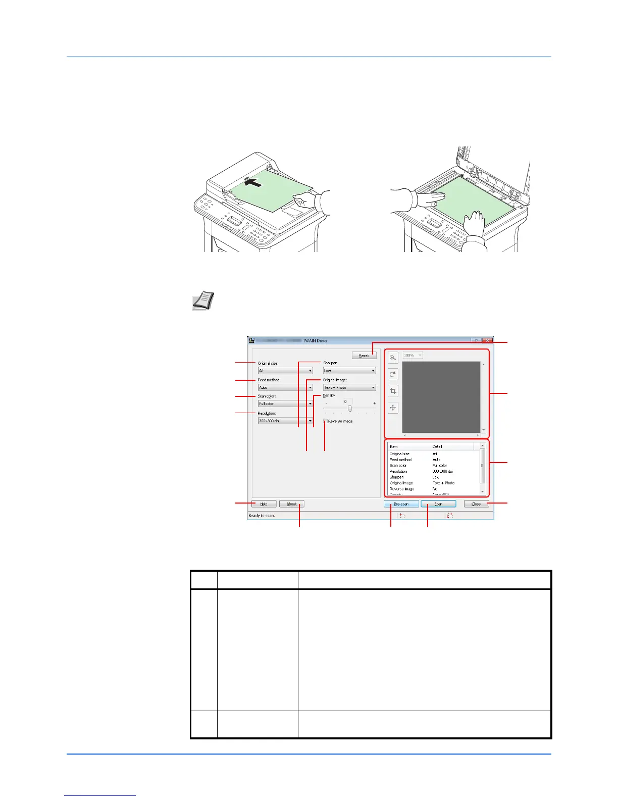 The procedure for scanning using the TWAIN driver is explained as an example. The WIA driver is used in the same way.