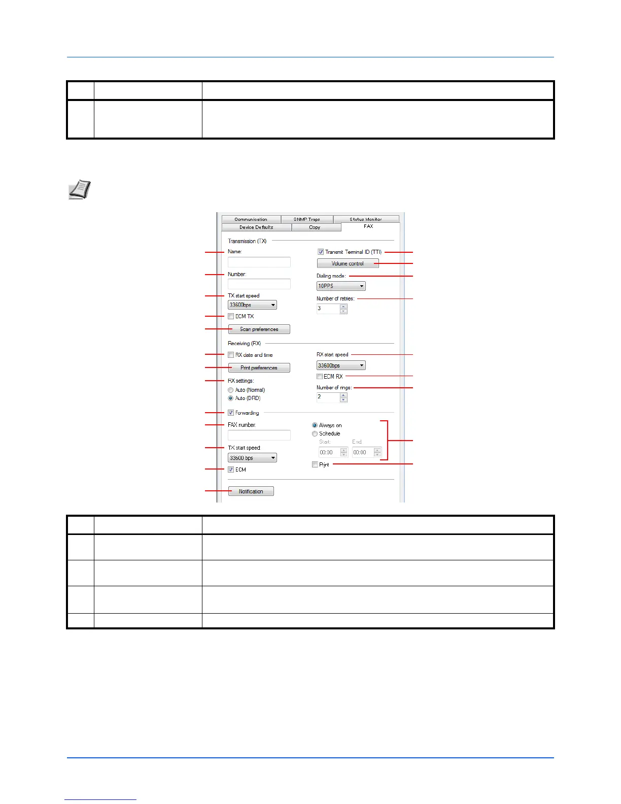 Note The FAX tab only appears for the FS-1120MFP, FS-1125MFP, FS-1320MFP and FS-1325MFP.
