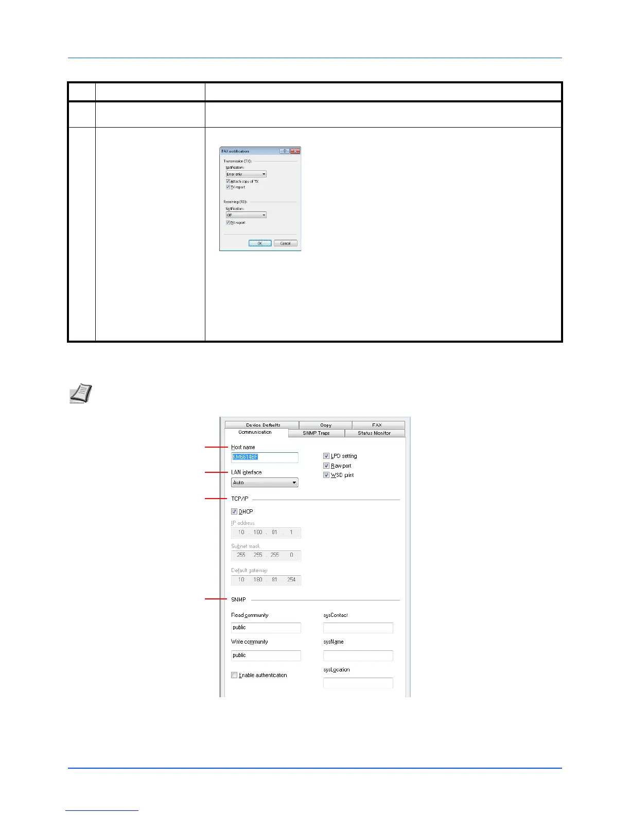 Note The Communication tab only appears for the FS-1025MFP, FS-1125MFP and FS-1325MFP.