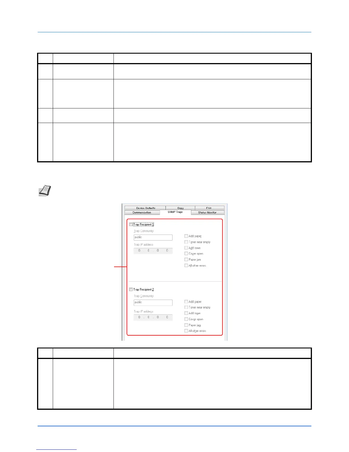Note The SNMP Traps tab only appears for the FS-1025MFP, FS-1125MFP and FS-1325MFP connected by