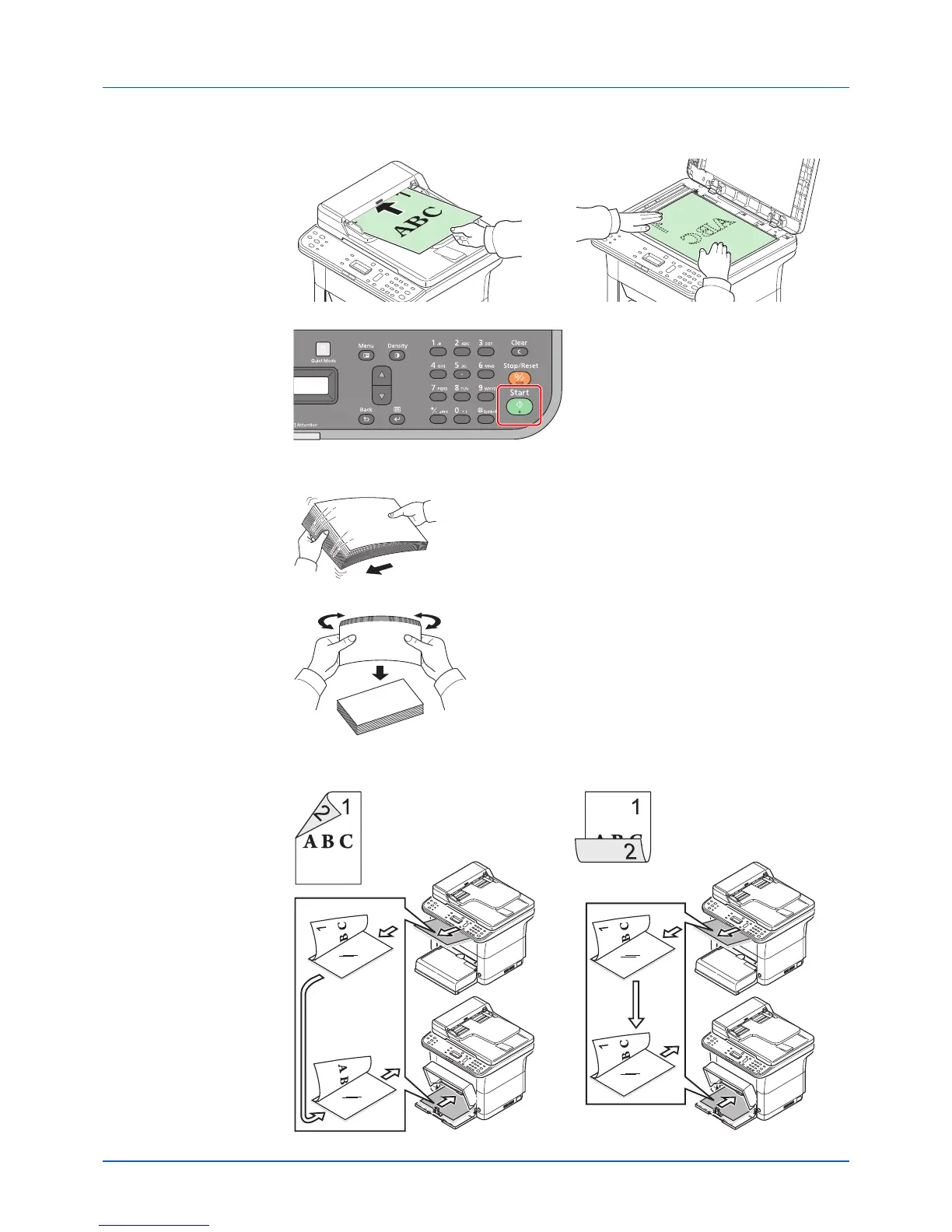 4 Copy the back side (or even numbered page). Load the paper as shown.