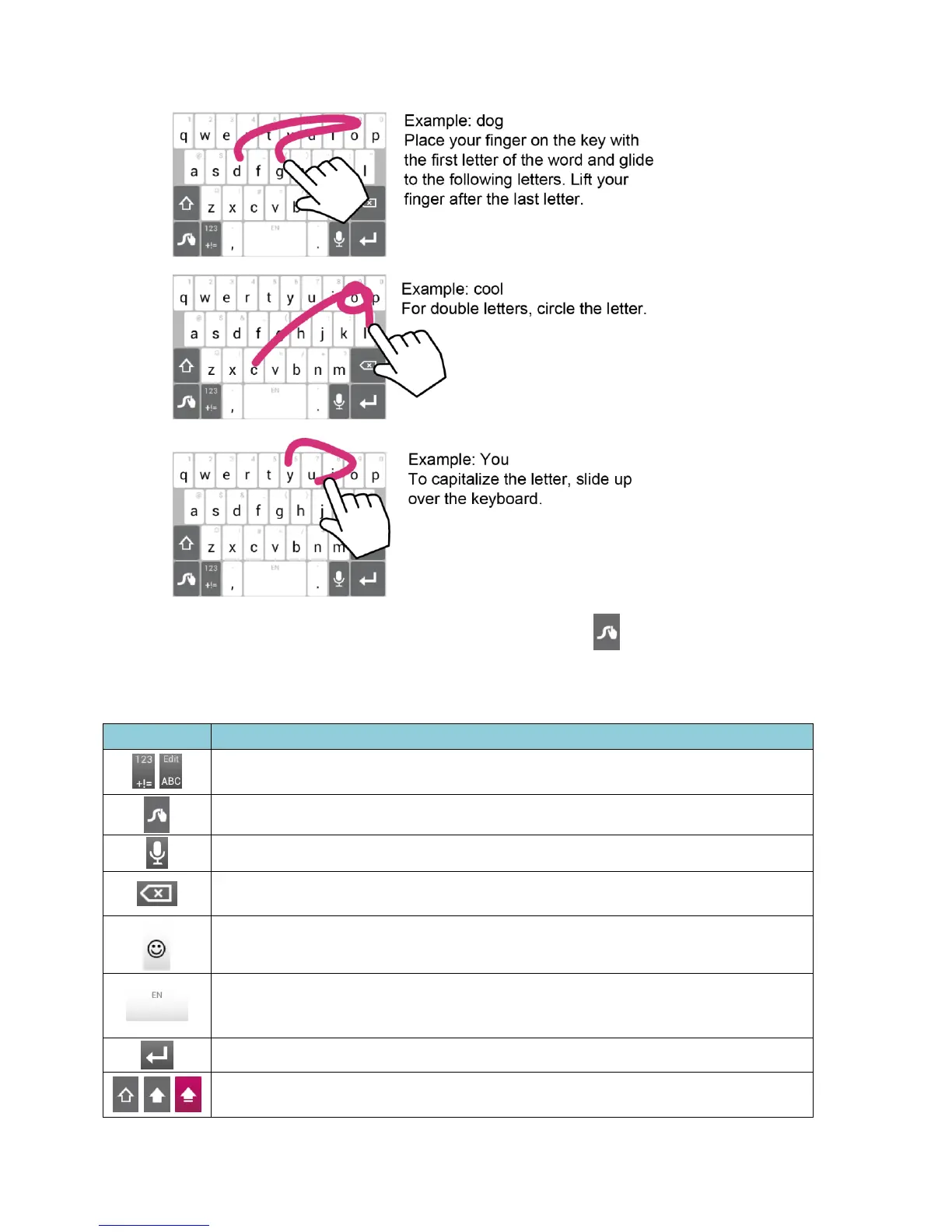 Some of the keys on the Swype keyboard are given below: