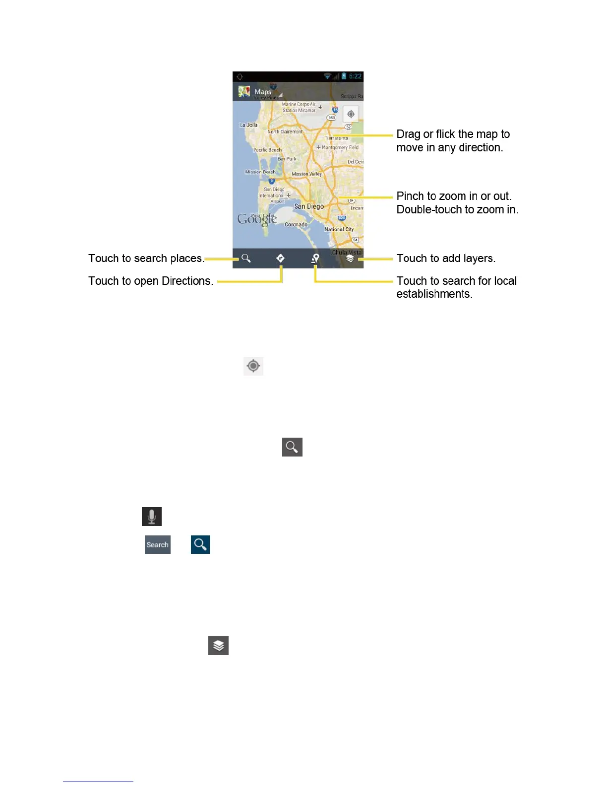 On the Google Maps screen, touch . A blinking blue arrow indicates your current location