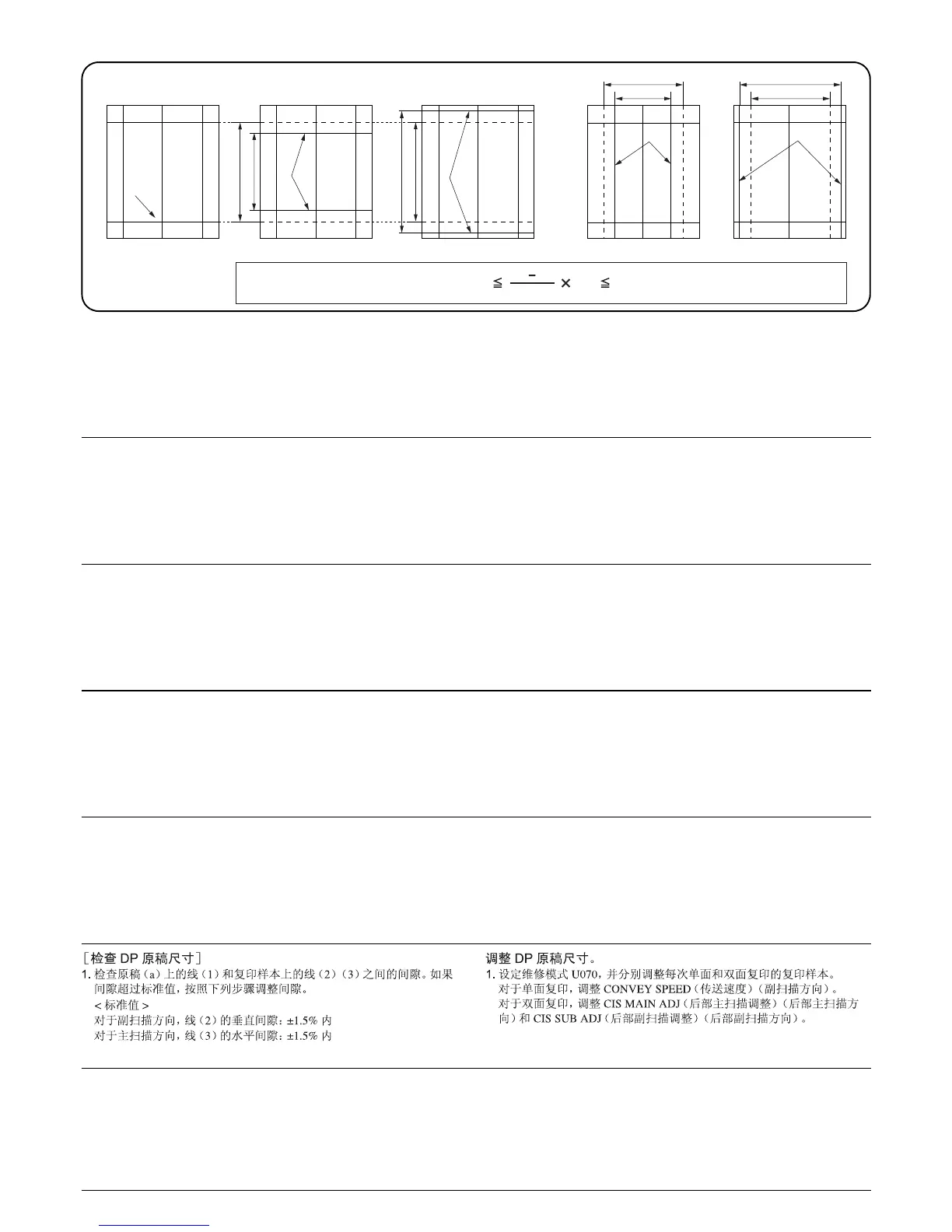 1. 原稿 (a) の線 (1) とコピーサンプルの線 (2)(3) のずれを確認する。ず