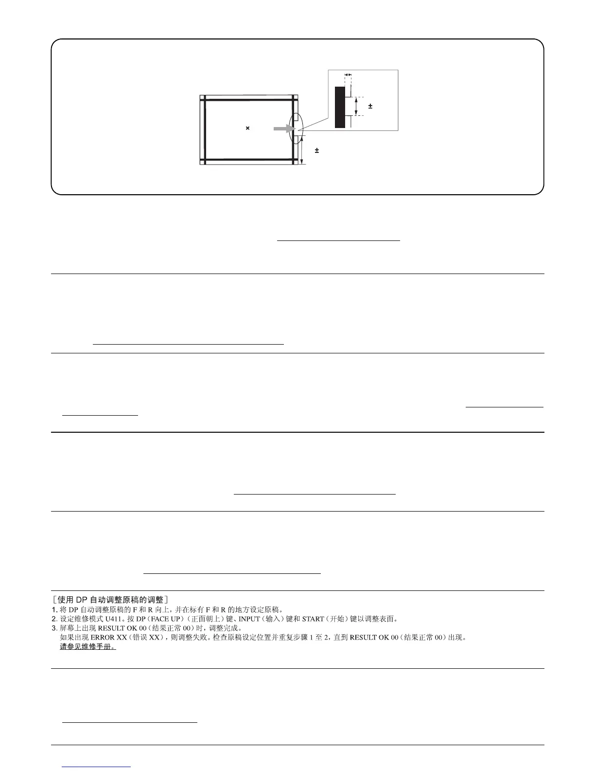 ERROR XX が表示された場合は調整失敗である。原稿のセット位置を確認し、RESULT OK 00 が表示されるまで手順 1 ~ 2 を繰り返す。