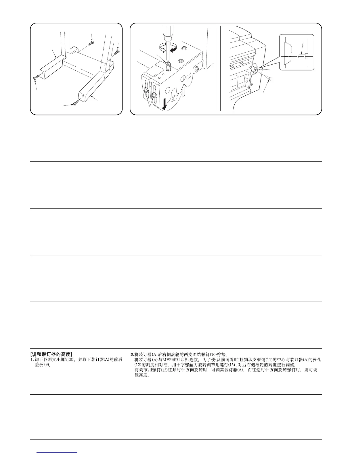 Note: Turning the adjustment bolt (13) clockwise lifts the document finisher (A), while turning it