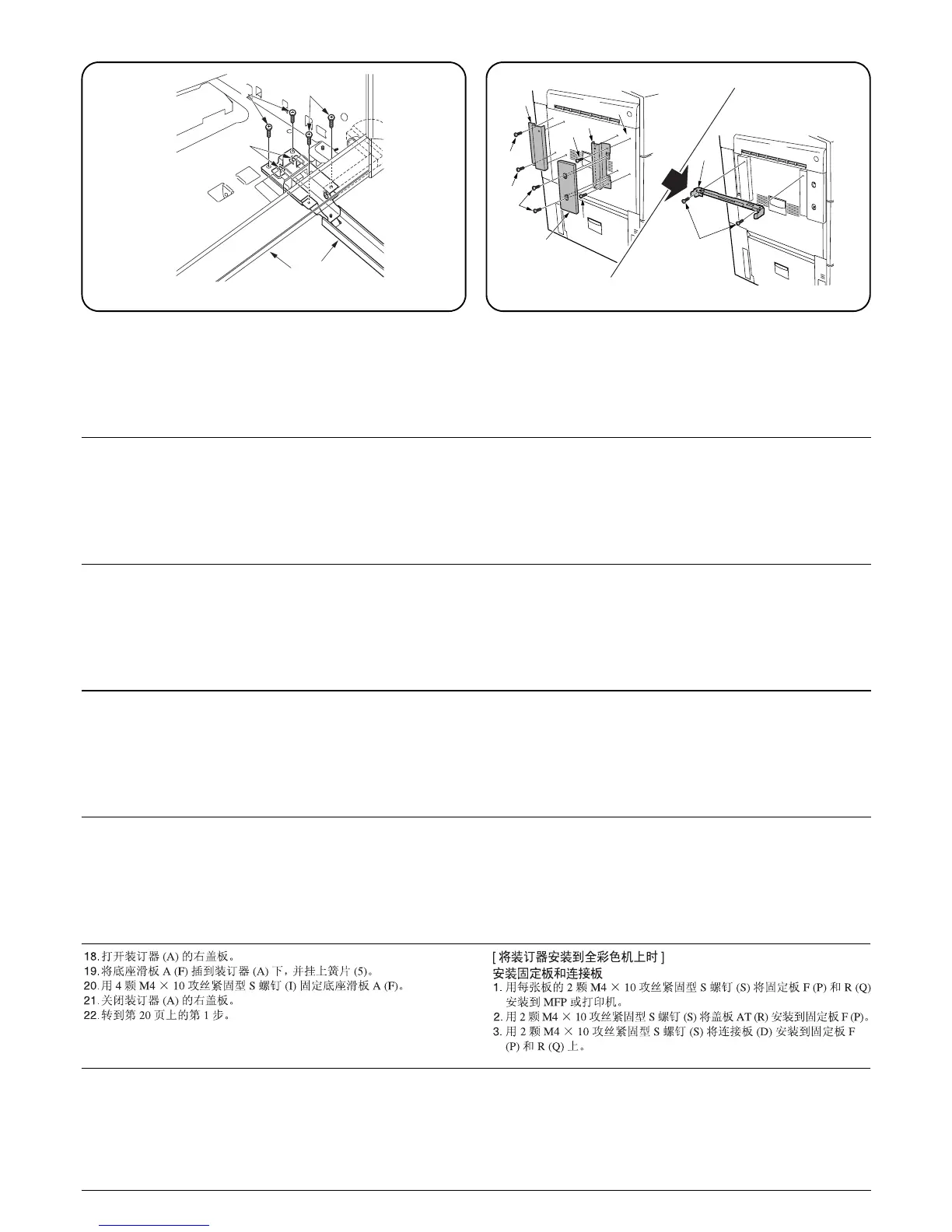 1. Install fixing plates F (P) and R (Q) to the MFP or the printer using two