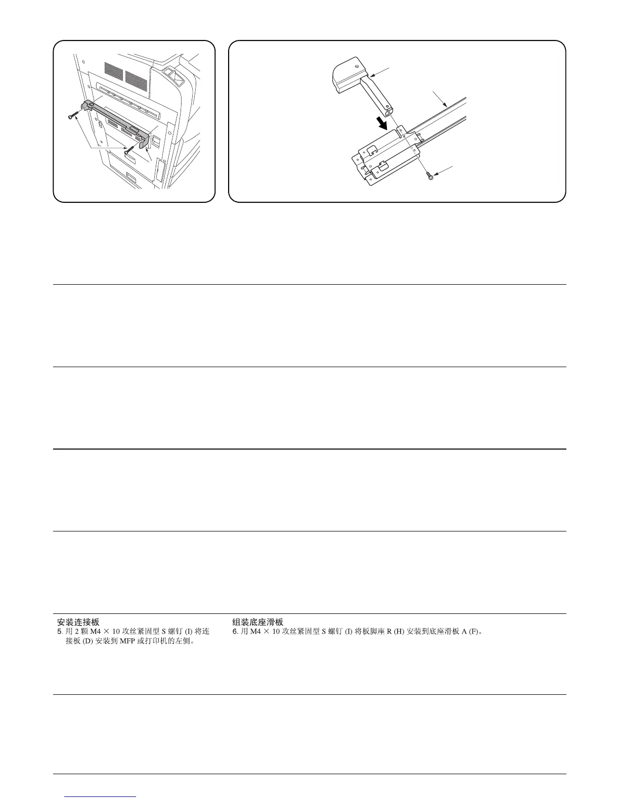 6. Install plate foot R (H) to base slider A (F) using M4 × 10 tap Tight S Screw (I).