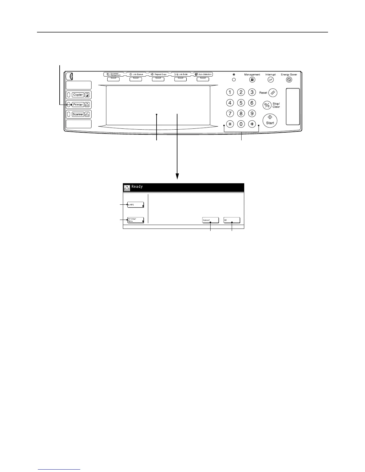 Printer key: Press when you want to switch the machine to the Printer mode and have the basic printer screen displayed on the touch