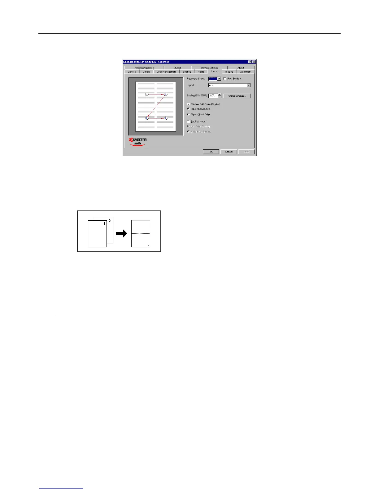 [Flip on Long Edge]............................. Select this option when making duplex prints in order to have the image on the two sides of the
