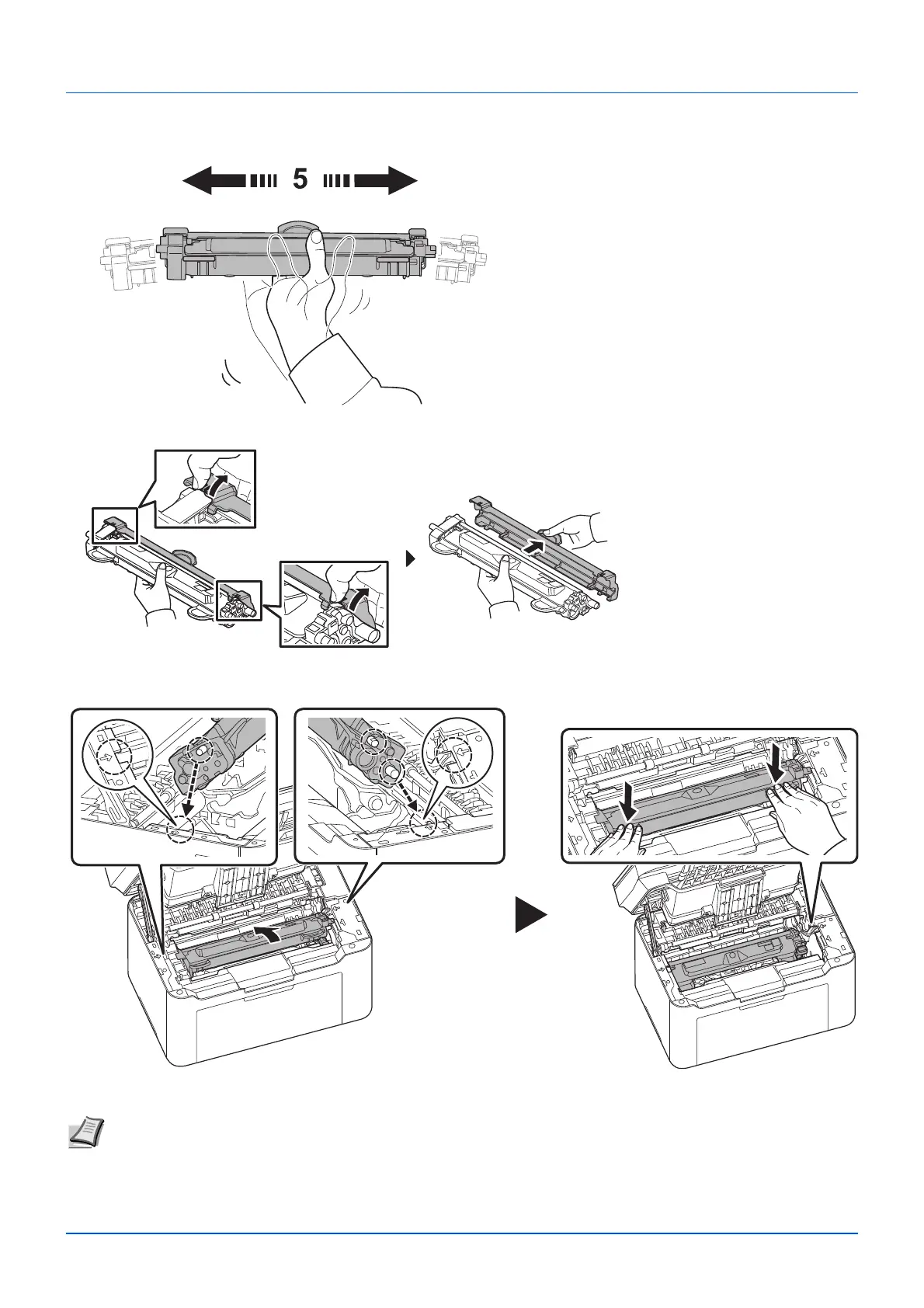 3 Take the new toner cartridge out of the toner kit. Shake the new toner cartridge at least 5 times as shown in the figure in order