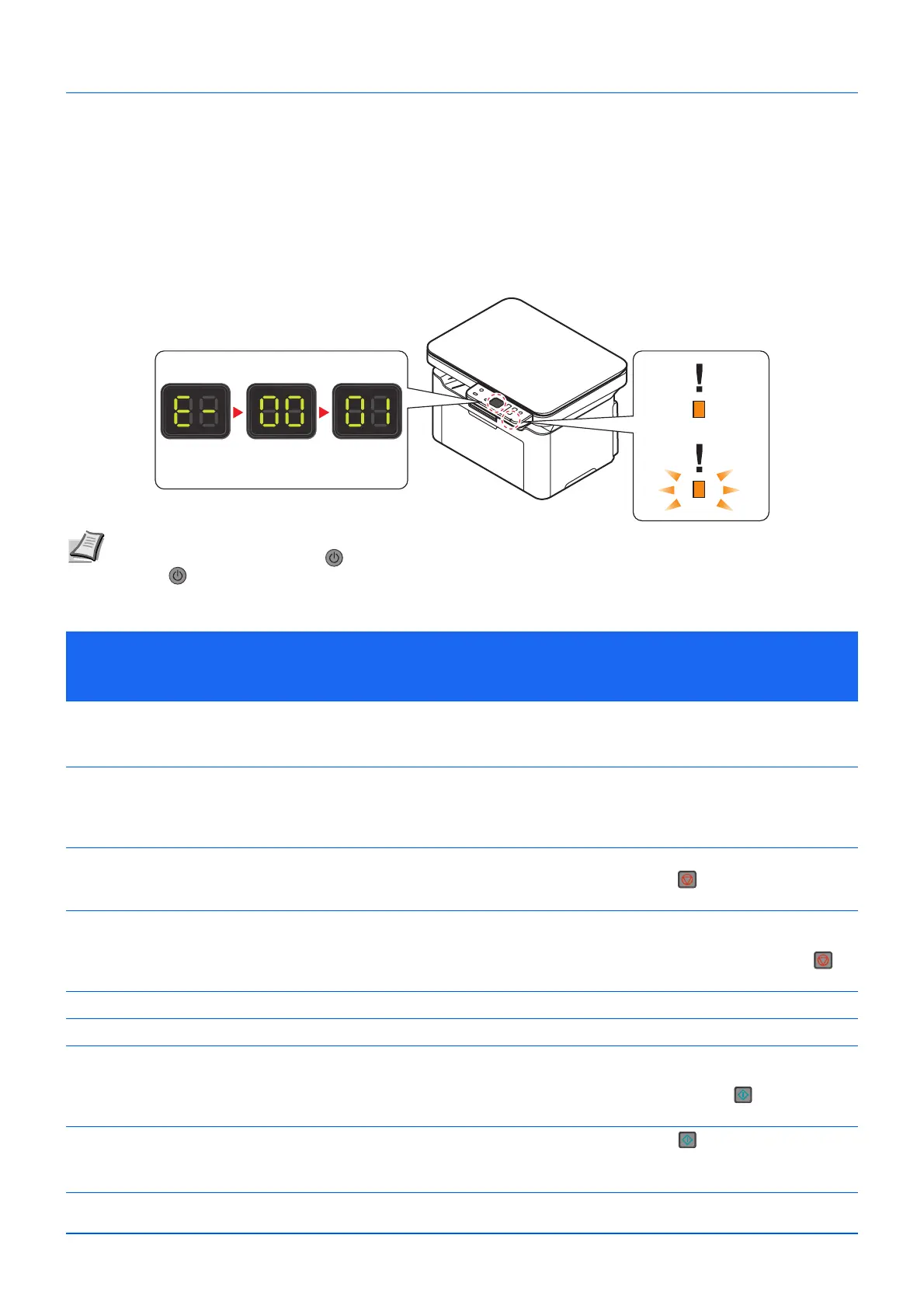 E7 Add toner The toner has run out. Replace with a new toner cartridge.