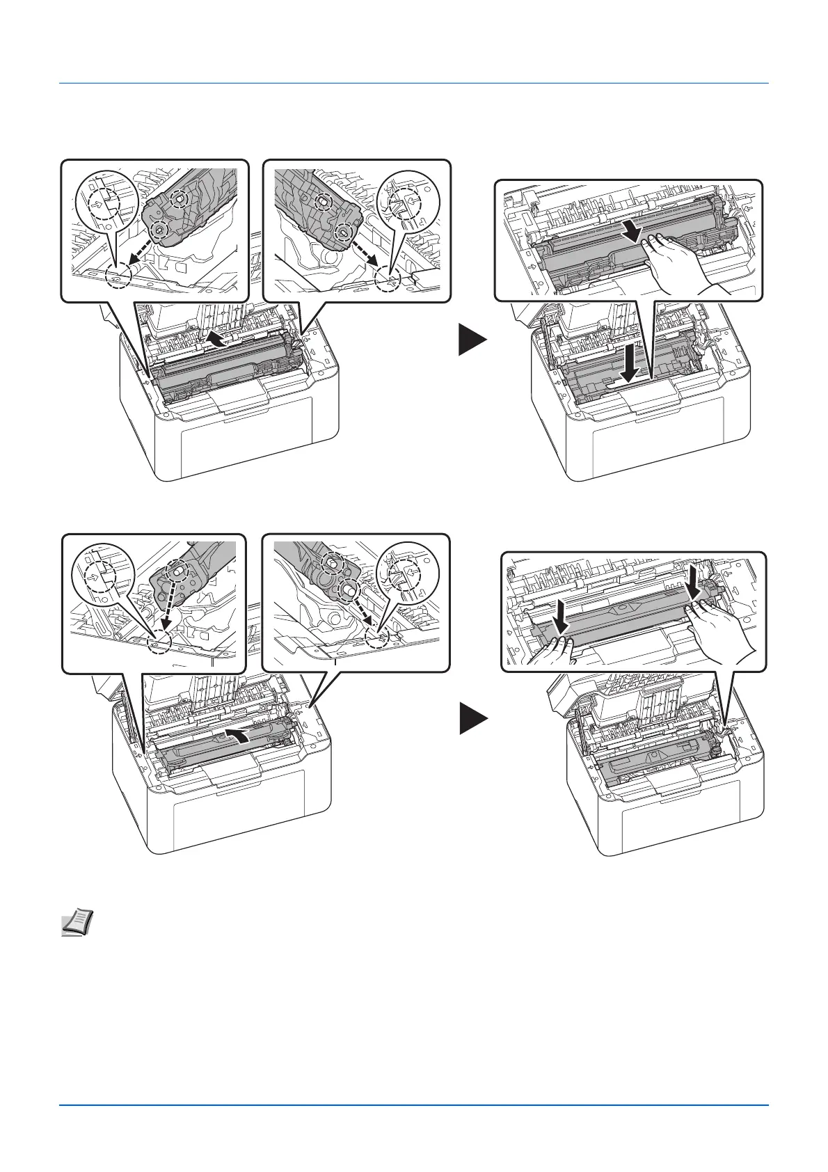 6 Set the toner cartridge to its position, aligning the guides at both ends with the slots in the machine. After that, press the