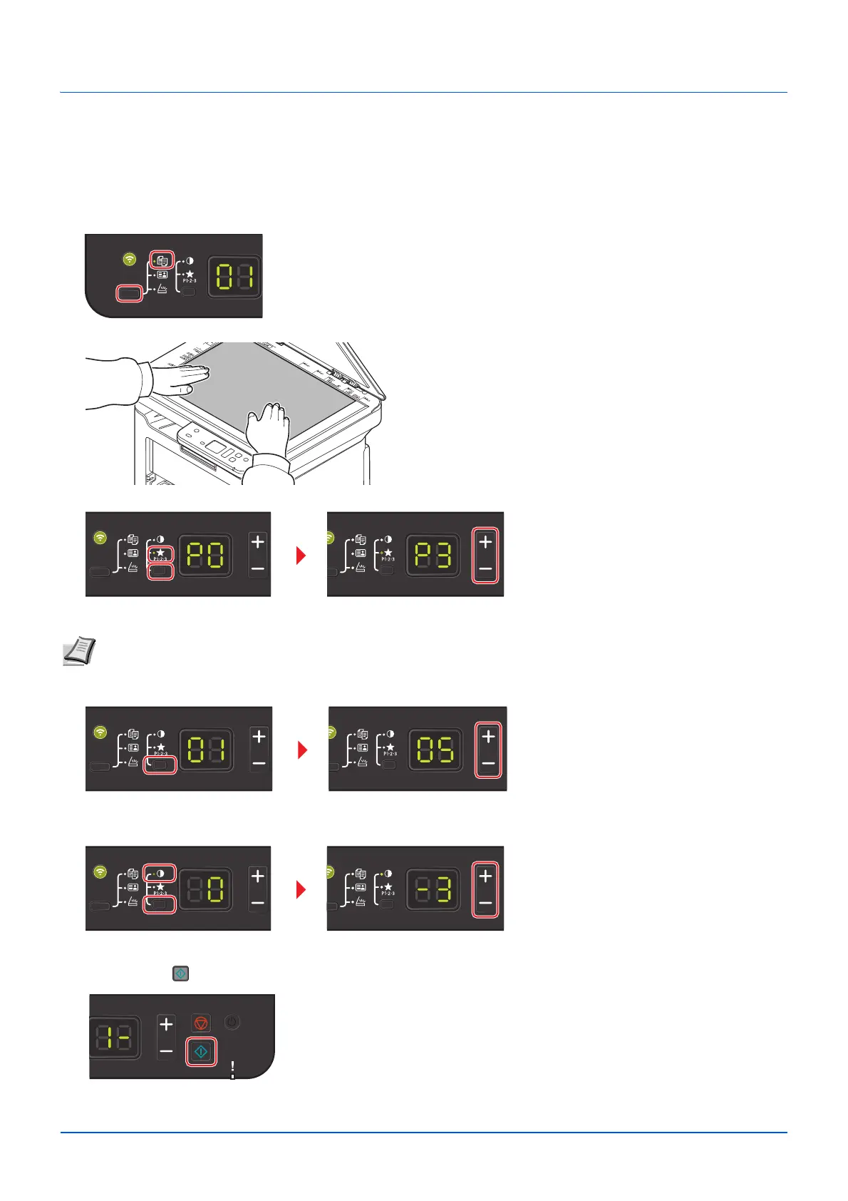 Press the Mode Select key to turn off the Function Indicators, and press [+] or [-] to enter the number of copies.