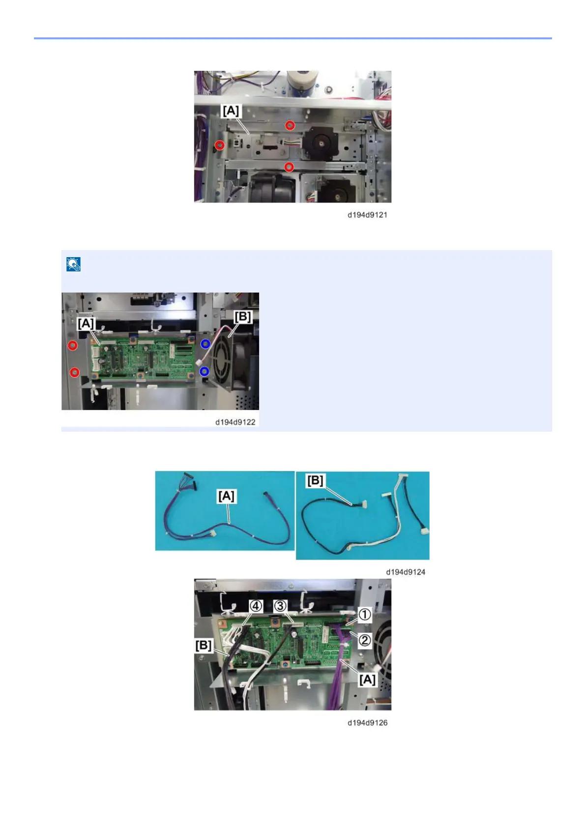 Tighten the fan assembly [B] and control board [A] together (blue circle).