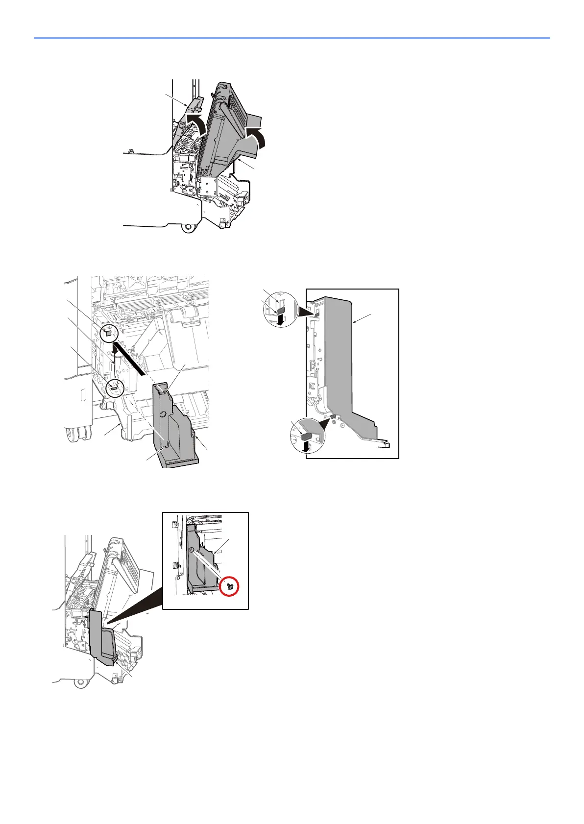 Attach the side cover rear [A] over the exit tray unit fixing rear [B]. Insert projections