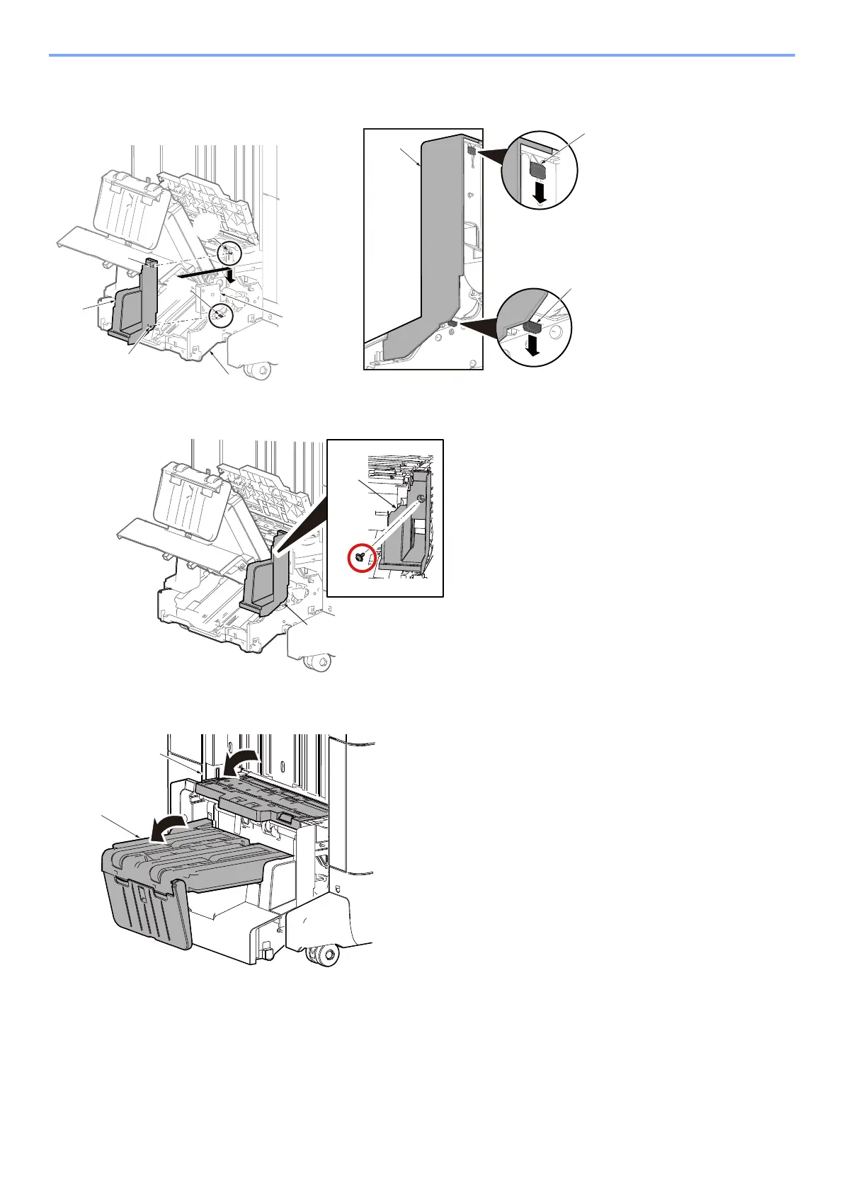 Attach the side cover front [A] over the exit tray unit fixing front [B]. Insert projections