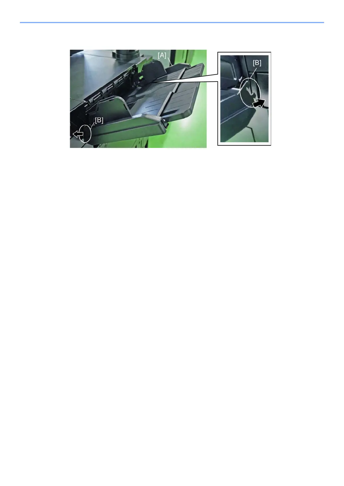 Attach the exit tray [A] to the main unit hooking up two (front and rear) hooks [B] of