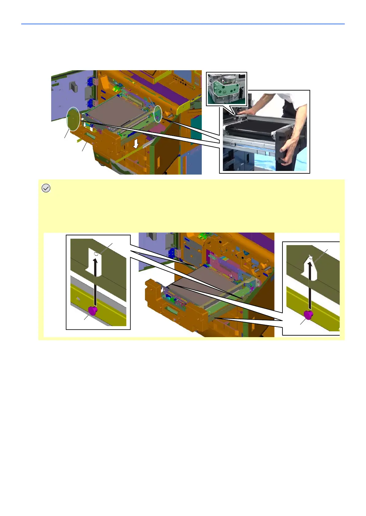 4 pins [C] on rails have to align with 4 holes [A] and [B] in frame of the image conveying unit. (Pay attention the