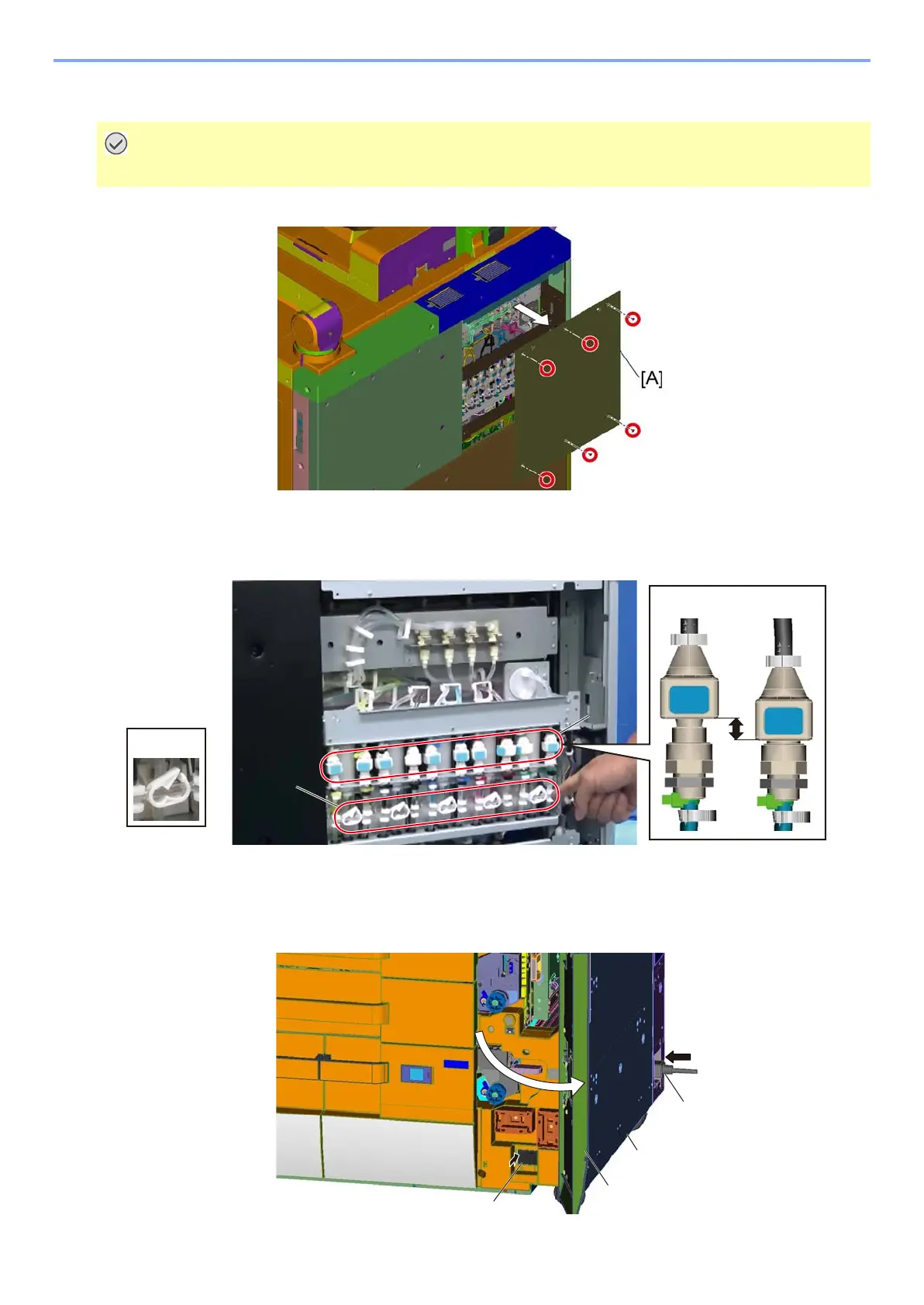 Check if all the clamps [A] and the couplings [B] of Y, K, C, M, CL in the ink unit are