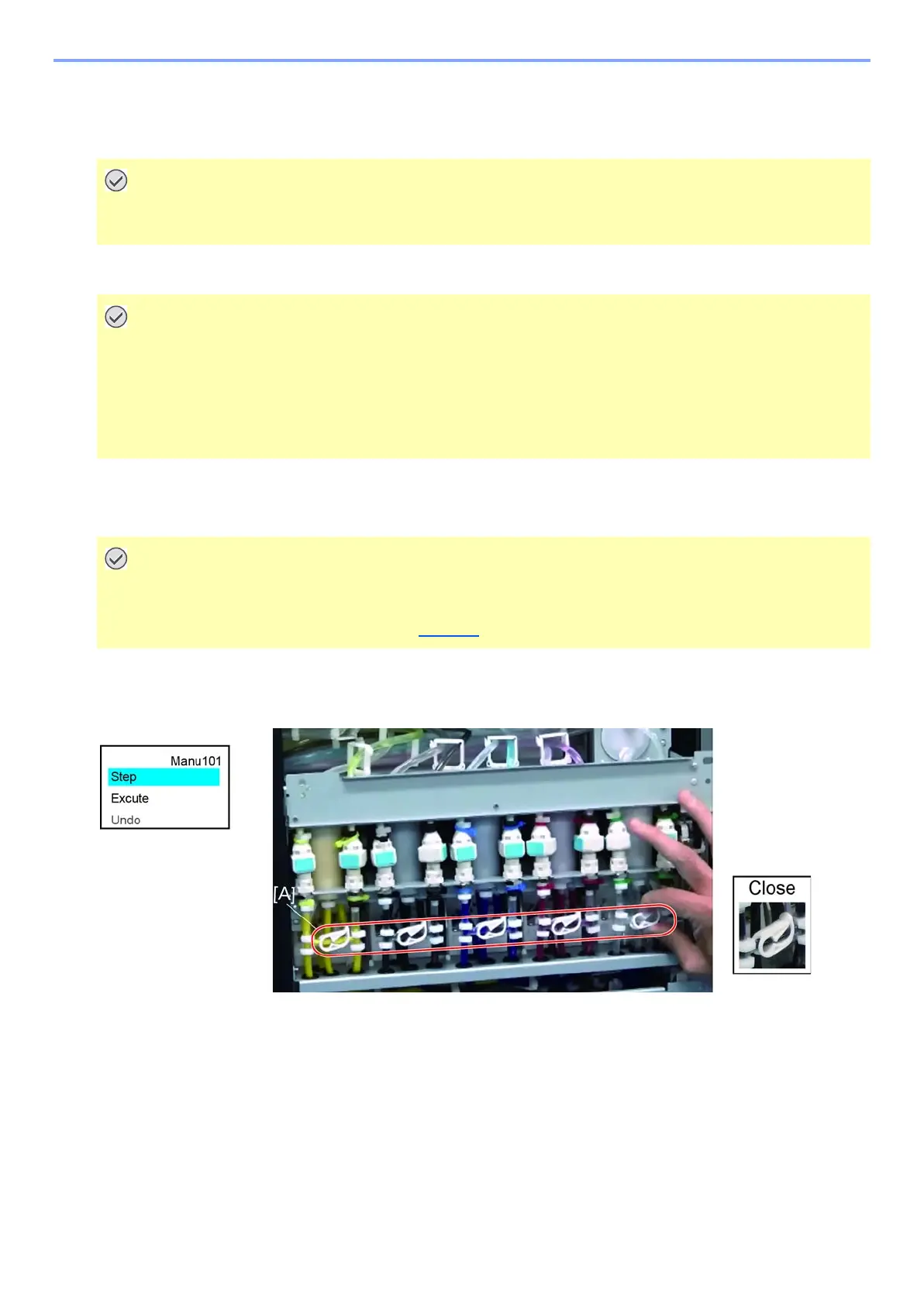 (Display: MANU0101) Close all the clamps [A] of Y, K, C, M, CL in the ink unit.