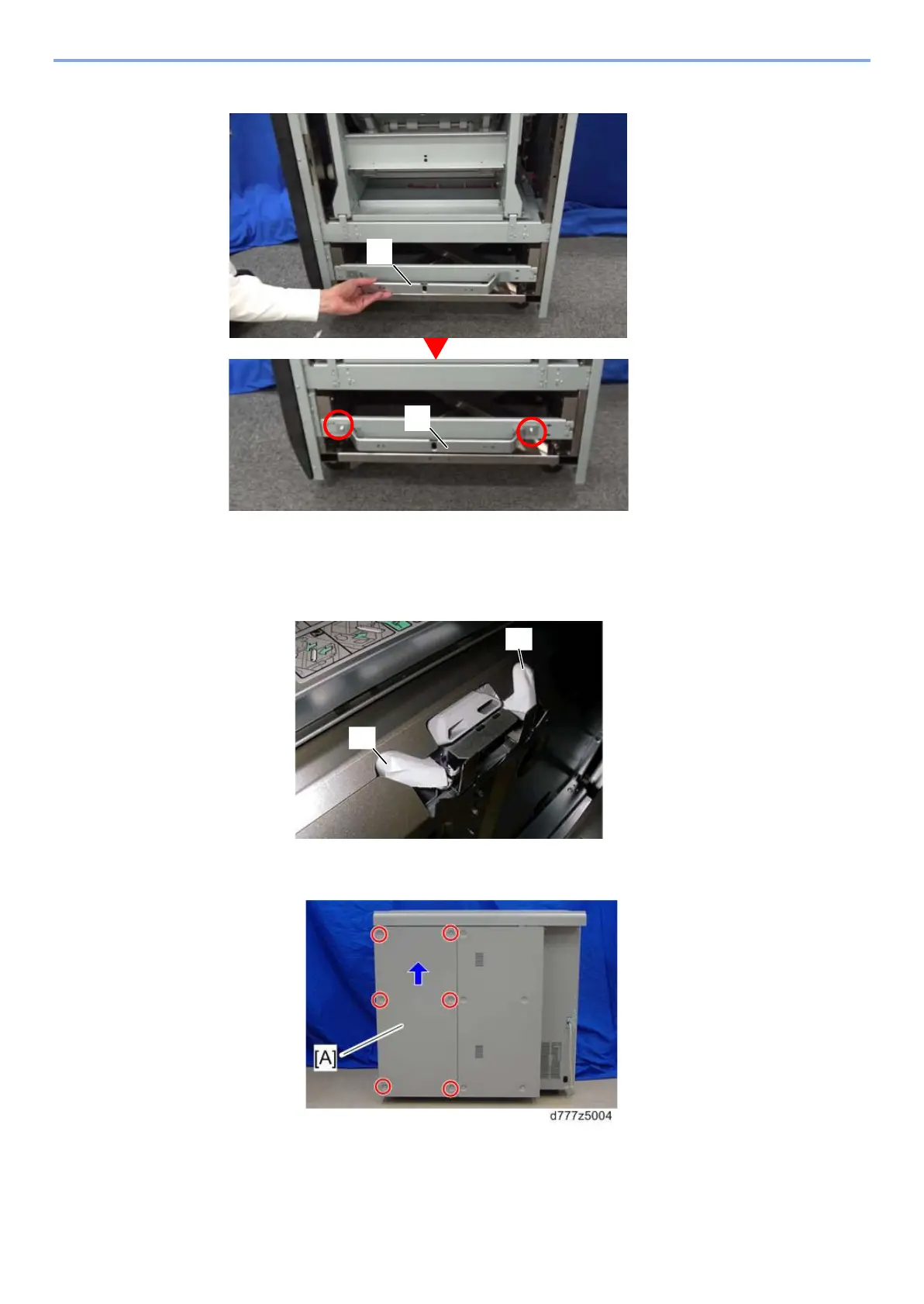 Lift the rear right cover [A] of the paper feeder slightly and remove it (screw x6).