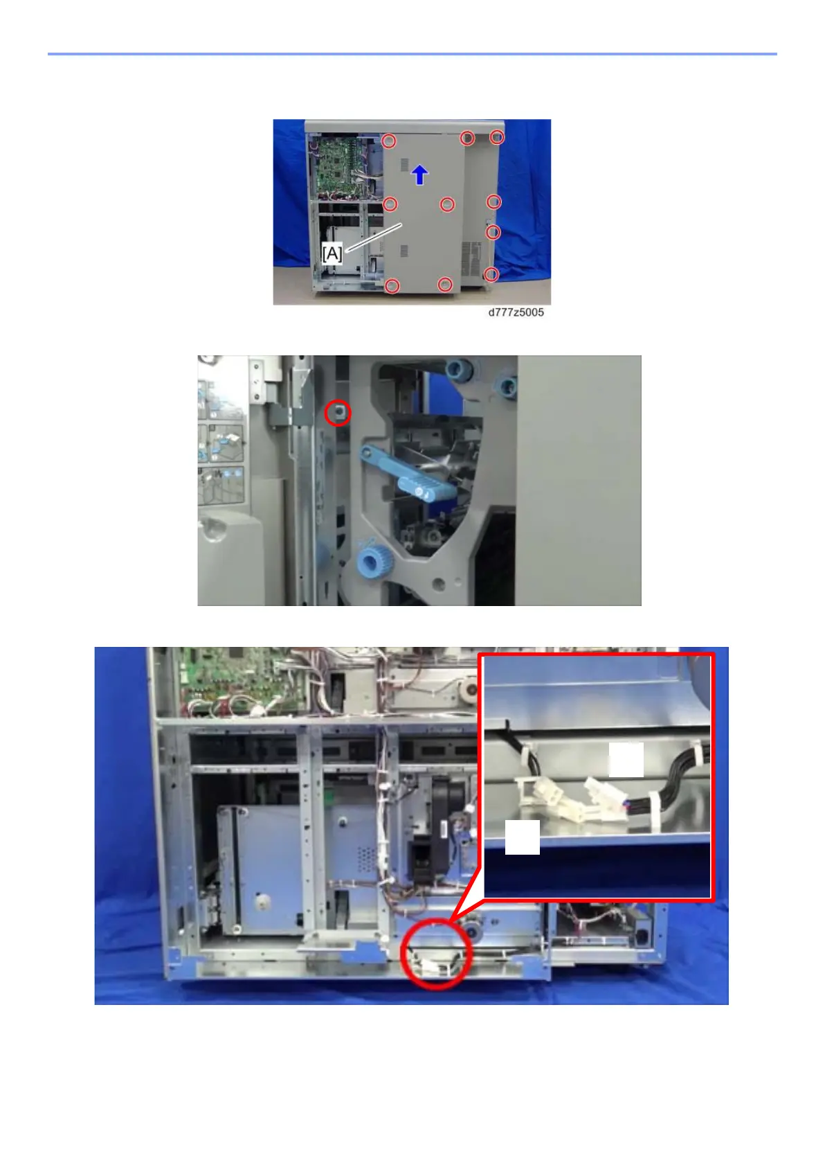 Lift the rear left cover [A] of the paper feeder slightly and remove it (Screw x10).