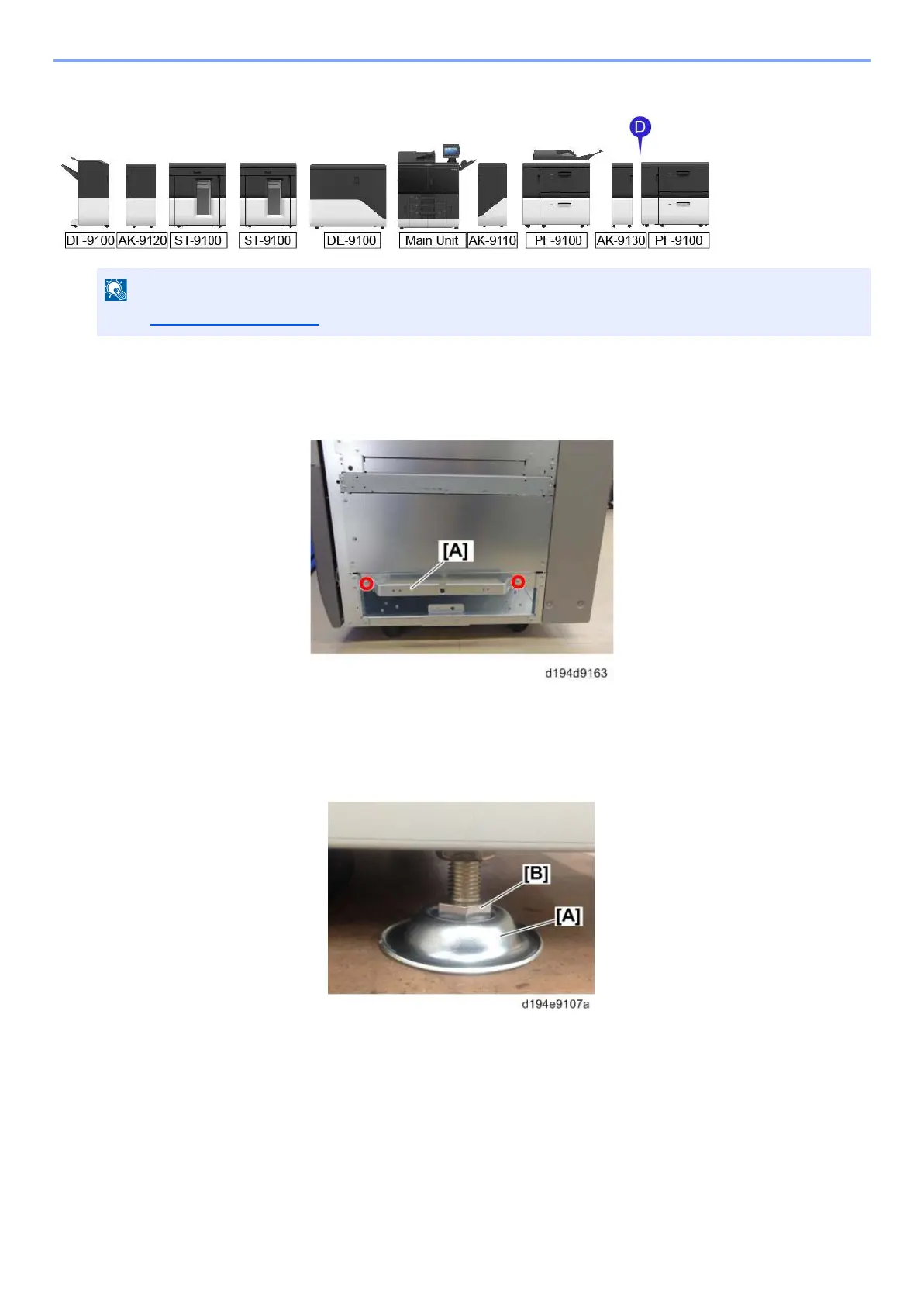 feeder. Turn the nuts [B] to lower the bolt until the bolts reach the leveling shoes [A].