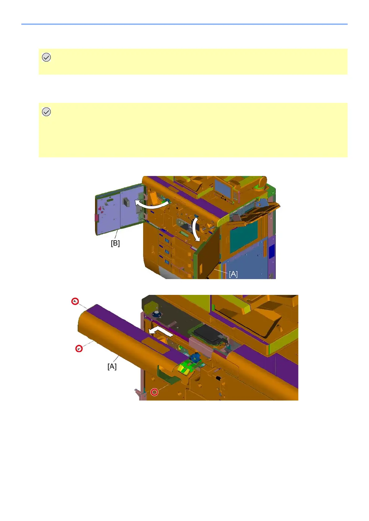 Open the front right upper cover [A] and the front left upper cover [B].
