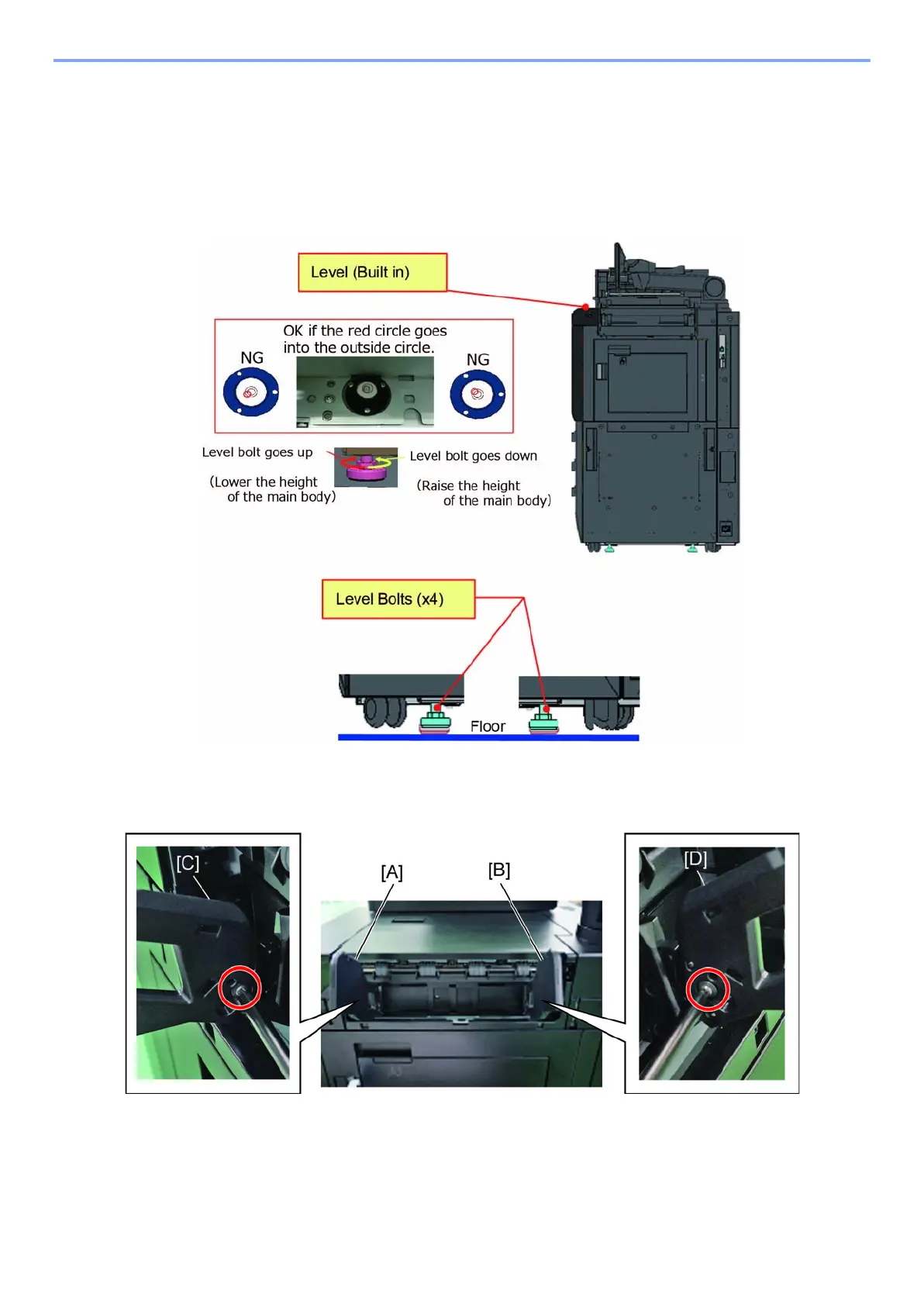 Check a leveler on the main frame and adjust the horizontal level by rotating the level