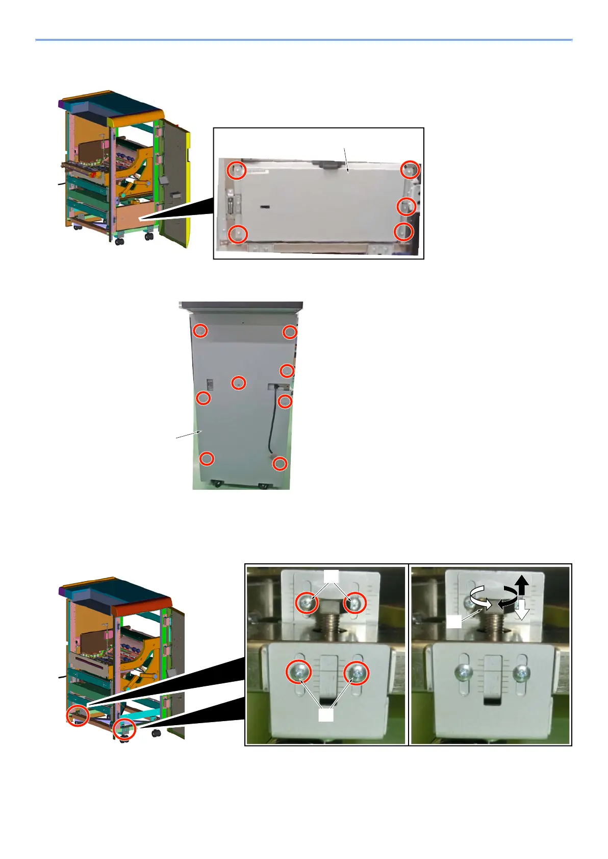 1 Loosen 8 screws [A] on the left front and rear. Turning the bolt [B] clockwise makes AK unit higher and