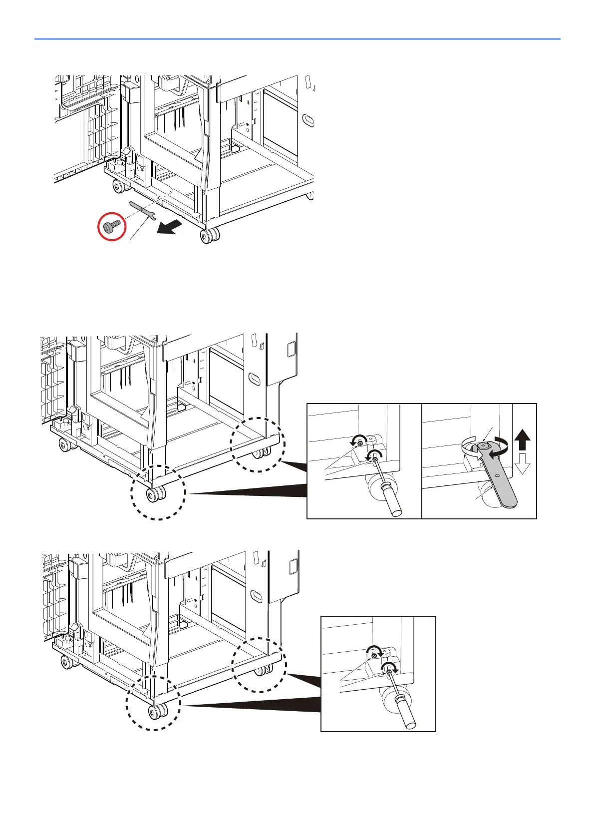 1 Loosen 2 screws [B] on the right front and rear of DF-9100. Turning the bolt [C] clockwise with the wrench [A]