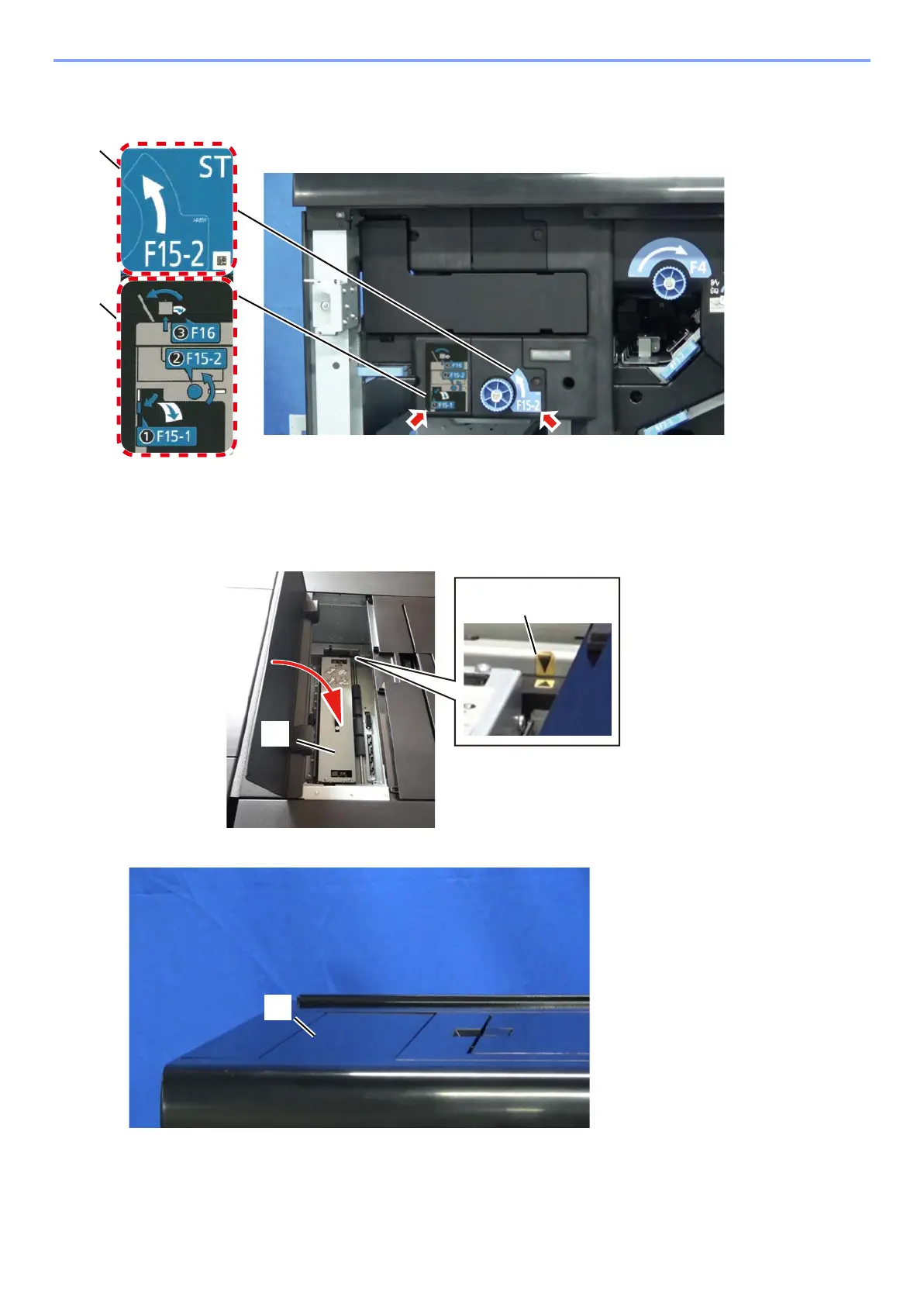 Attach decurler unit [A] (DE-9100) Confirm if triangle marks [B] are at same position.