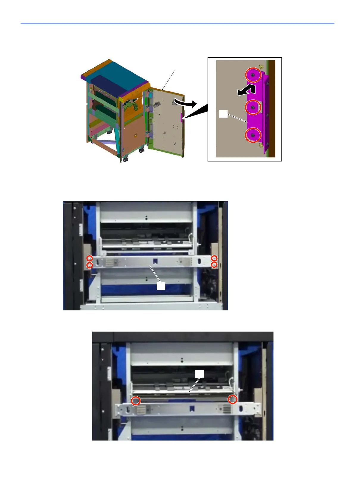 Open the front cover [A] and remove plate [B] (Screw X3). The plate [B] and screws