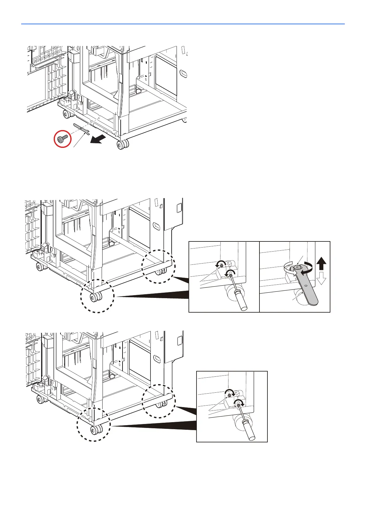 1 Loosen 2 screws [B] on the right front and rear of DF-9100. Turning the bolt [C] clockwise with the wrench [A]