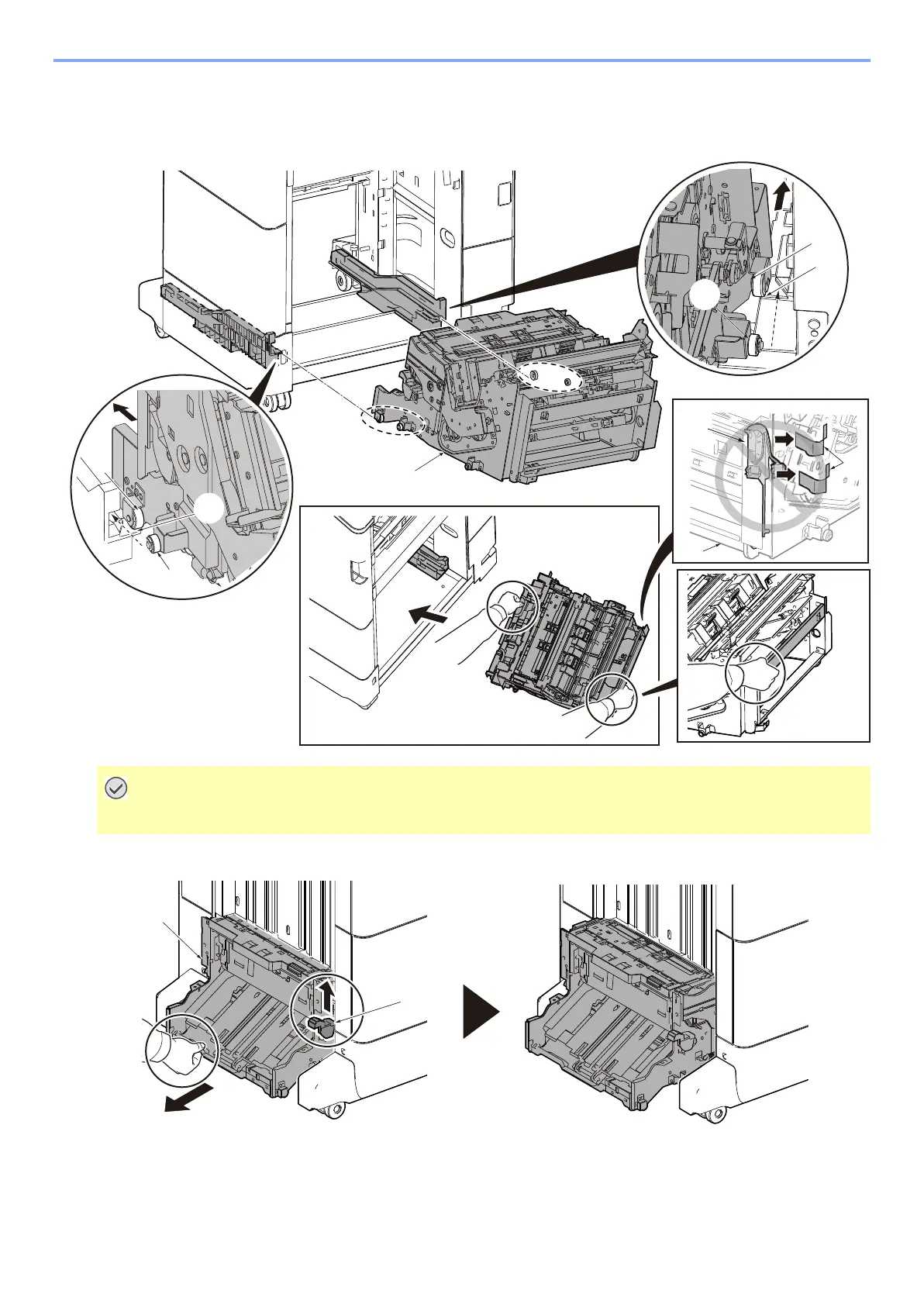 Release lock lever [B] and pull out the folding unit {A] from DF-9100 to the left.