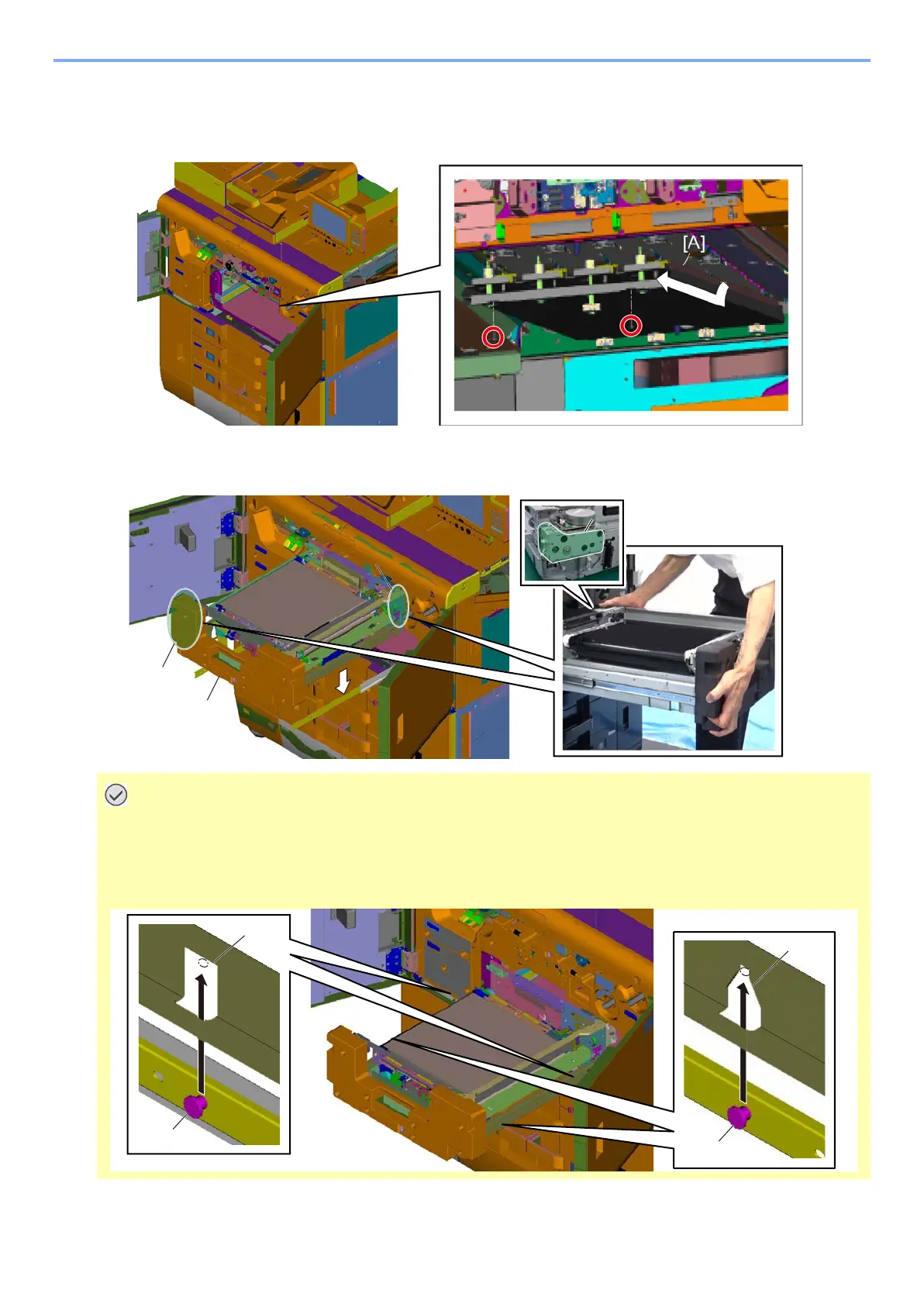 4 pins [C] on rails have to align with 4 holes [A] and [B] in the frame of the image conveying unit. (Pay attention